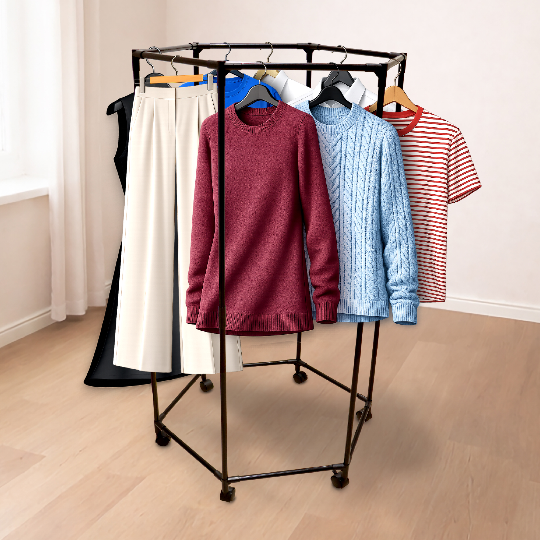 360°回転ハンガーラック [ AXL-913 ] 収納ハンガーラック 6面構造で限られたスペースでも分散干し、家族の衣類管理に役立ちます。 実入り数 16個/8個 発送単位 16 参考上代 3,980 カラー ブラック サイズ 対角幅:約73cm 高さ:約120cm(組み立て時) 重 量 約1.2㎏ 主材質 鉄、ポリプロピレン 品 番 AXL-913 JANコード 4580399760816 保証書 有 取扱説明書 無 その他備考 全体合計耐荷重:約9㎏以内 1面につき:約1.5㎏ 動画を見る ✖️ 弊社で公開している動画はYouTubeから視聴できます。 公式youtubeチャンネルを開く マニュアルをDL ✖️ ご利用規約にご同意いただいた上でご利用ください。 製品の仕様は改良等で予告なく変更する場合がございます。 取扱説明書の一覧ページを開く 製品画像をDL ✖️ 製品ダウンロードの一覧ページを開くには当社指定のパスワードが必要です。 製品画像はzipファイル形式で圧縮しています。 ご利用規約にご同意いただいた上でご利用ください。 製品の仕様は改良等で予告なく変更する場合がございます。 製品画像ダウンロードの一覧ページを開く 企画書をDL ✖️ 企画書ダウンロードの一覧ページを開くには当社指定のパスワードが必要です。 企画書はjpgファイル形式で圧縮しています。 ご利用規約にご同意いただいた上でご利用ください。 製品の仕様は改良等で予告なく変更する場合がございます。 企画書ダウンロードの一覧ページを開く 生産について