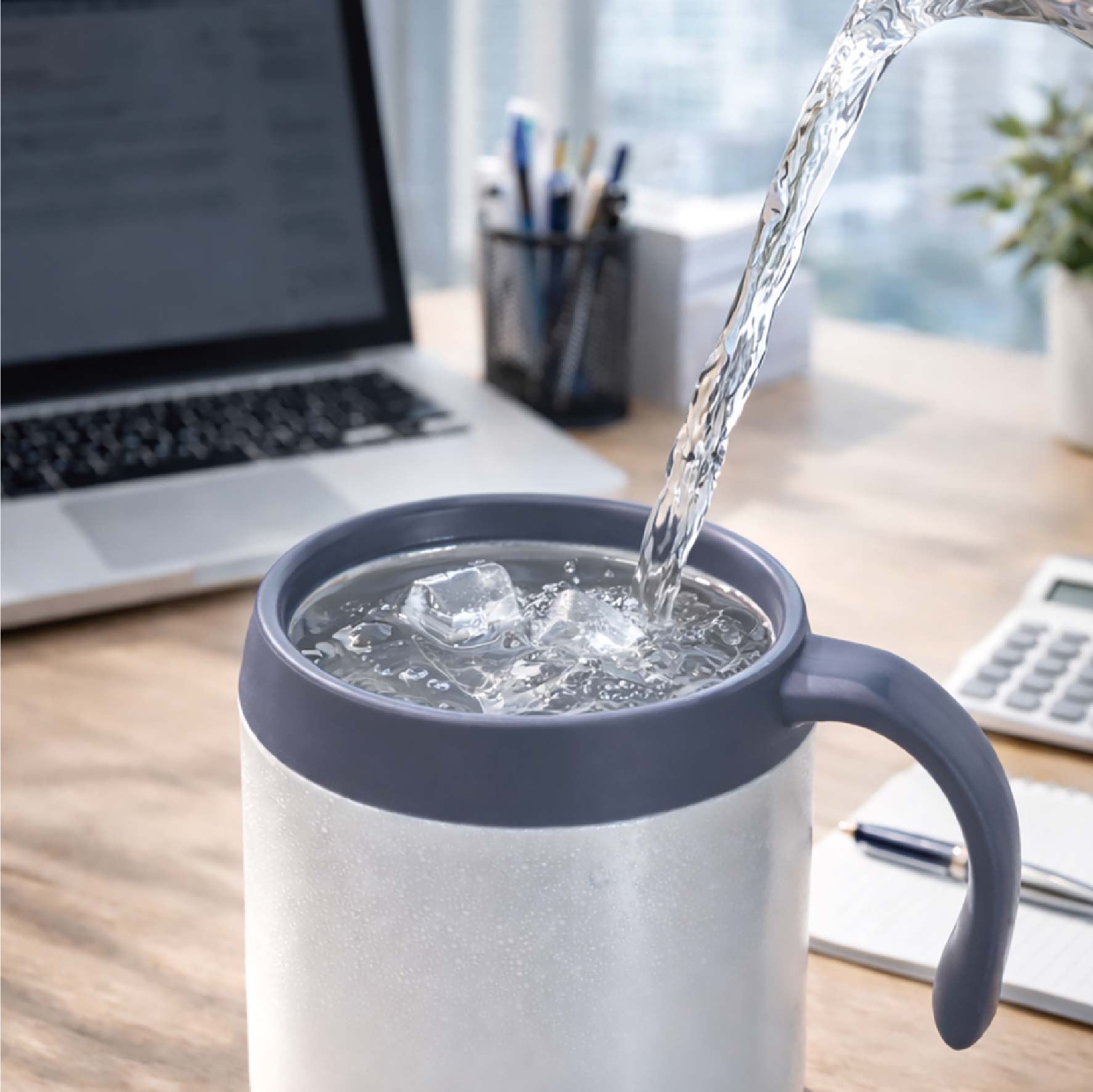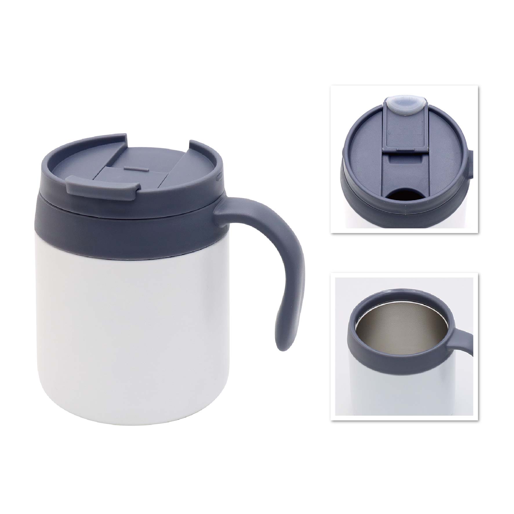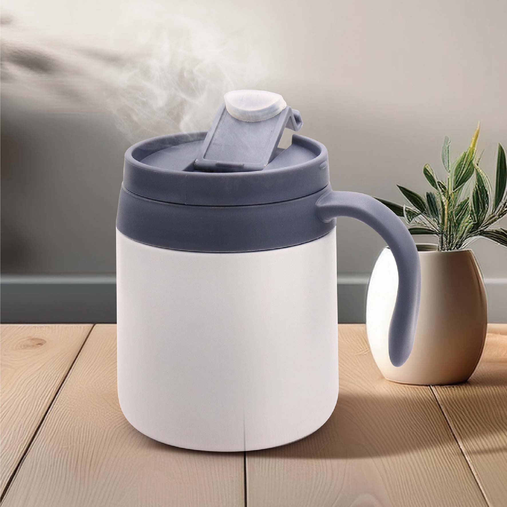 真空断熱二重構造で飲み物の温度を保つ取っ手付きのタンブラーです。ふたがついているので、より保冷・保温が可能です。