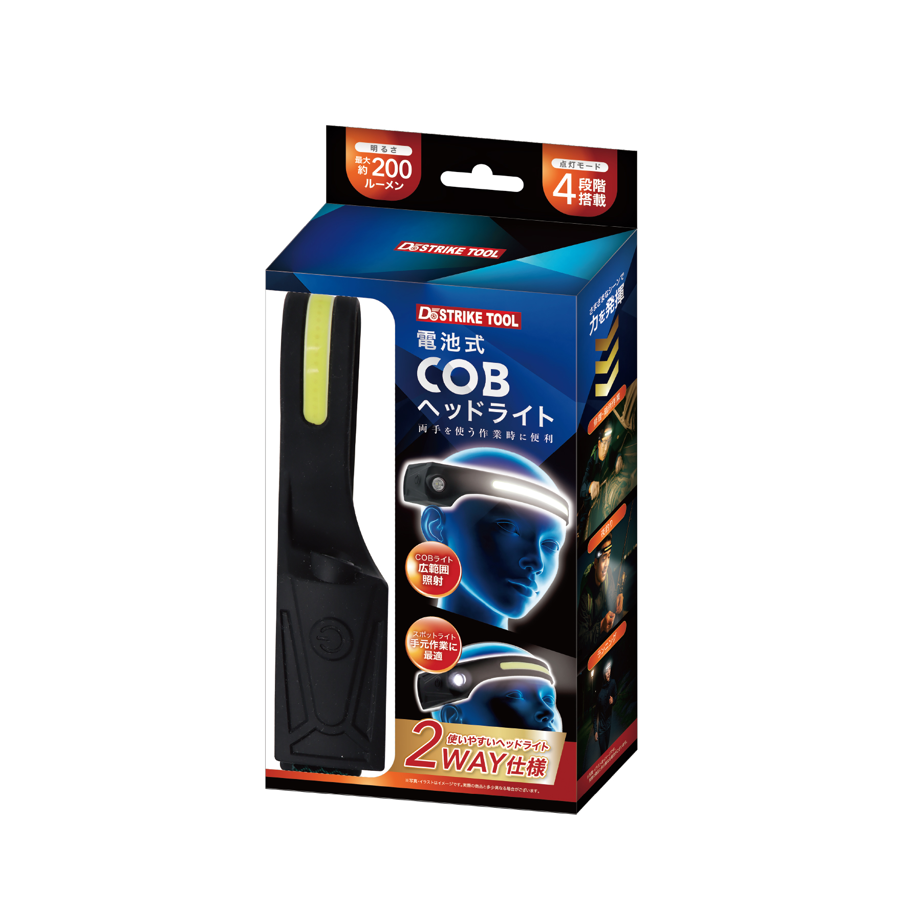 広く照らせるCOBライトと手元作業に最適なスポットライト搭載の電池式COBヘッドライトです。用途に合わせて選べる4モードで暗所作業や非常時に便利です。