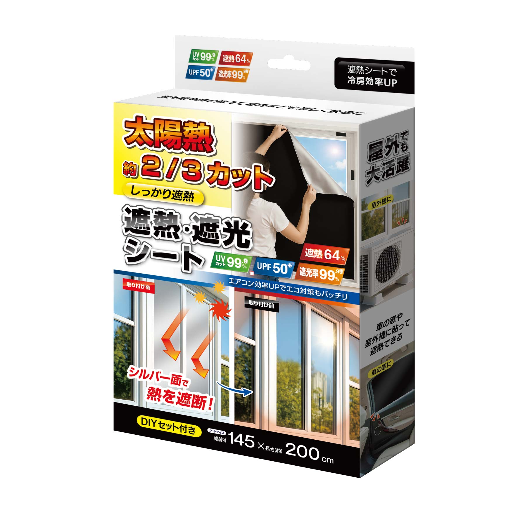 太陽熱を2/3カットする遮熱・遮光シートです。オックス生地でしっかり遮熱。シルバー面が太陽光を効果的に反射し、室内の温度上昇を抑えます。