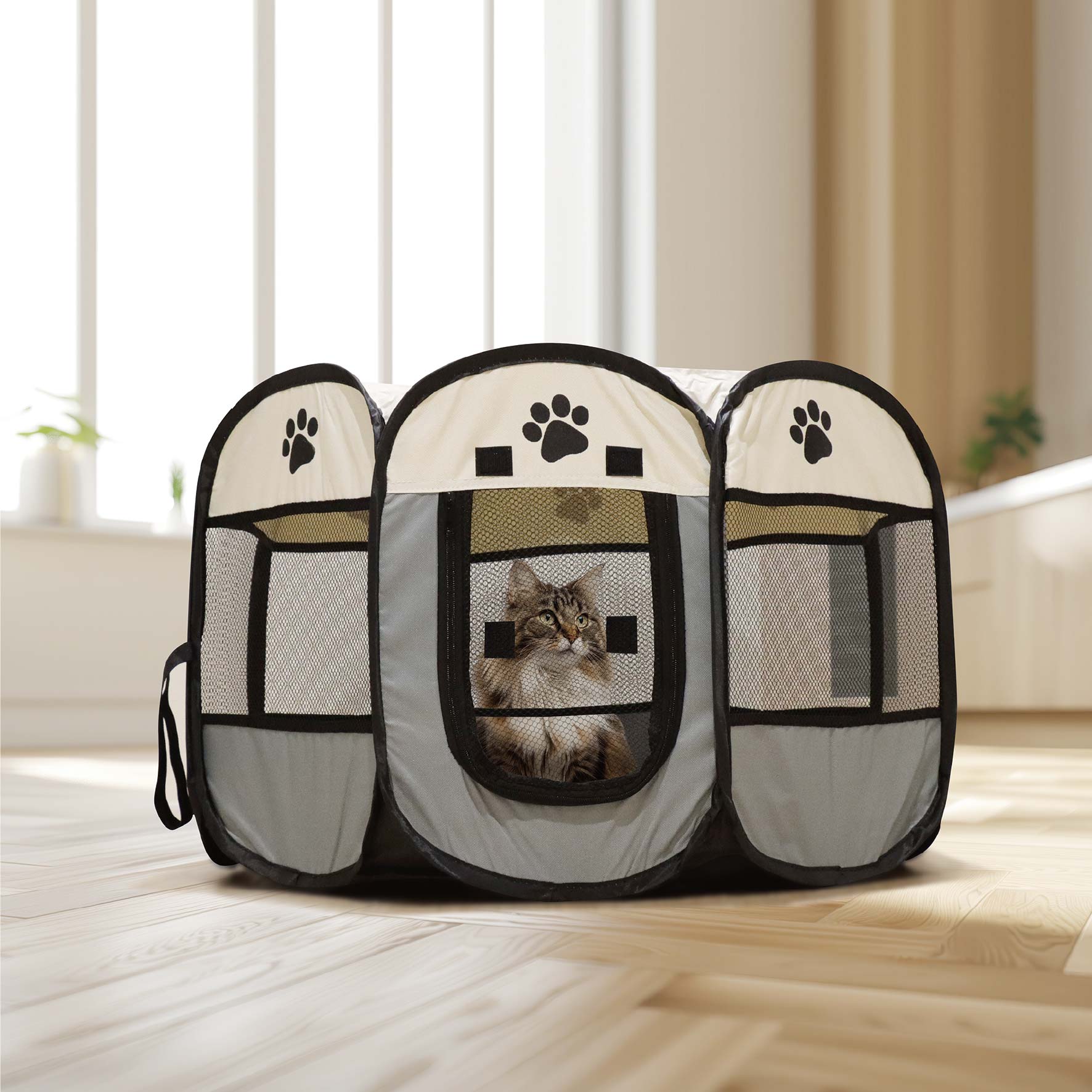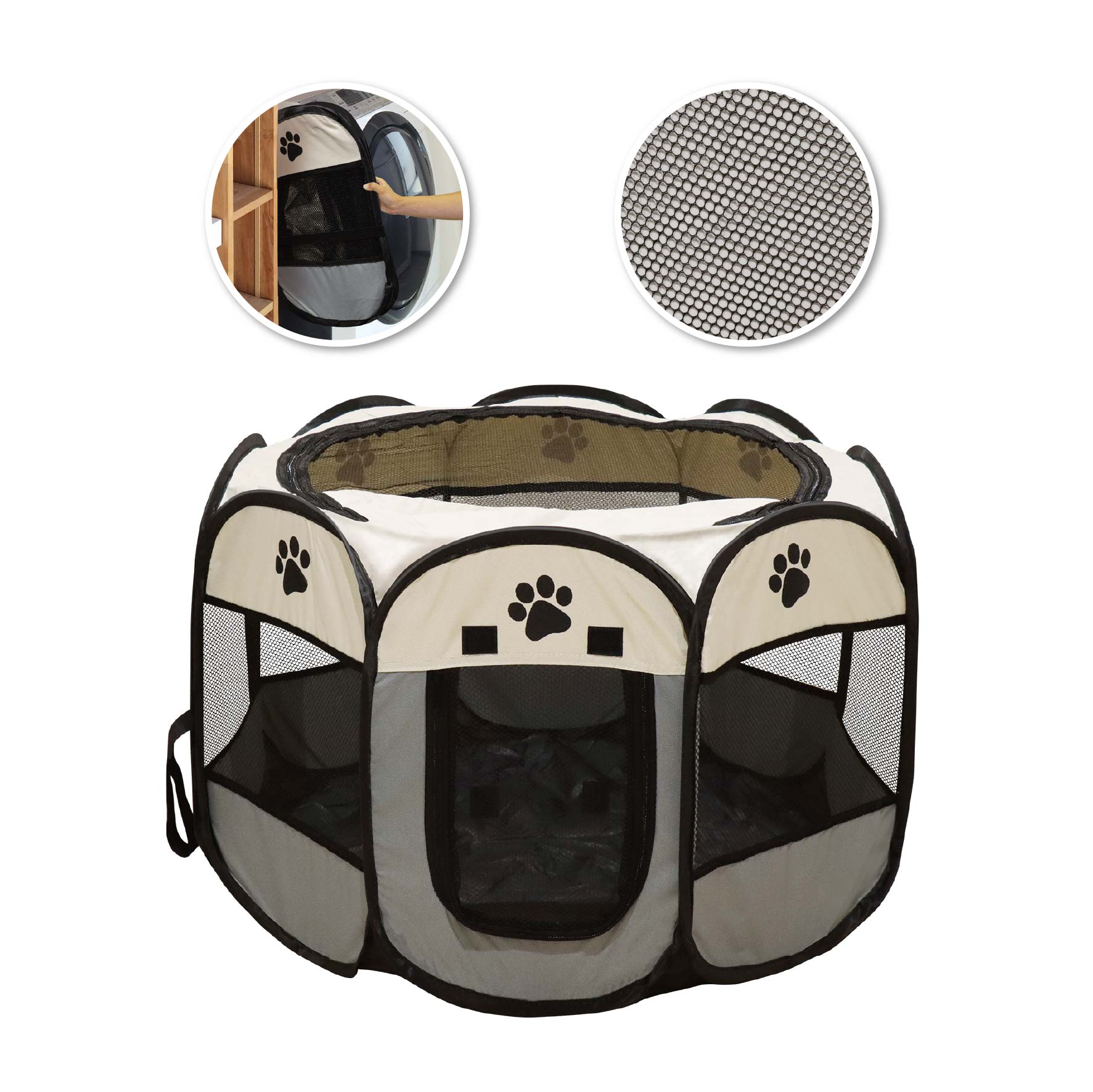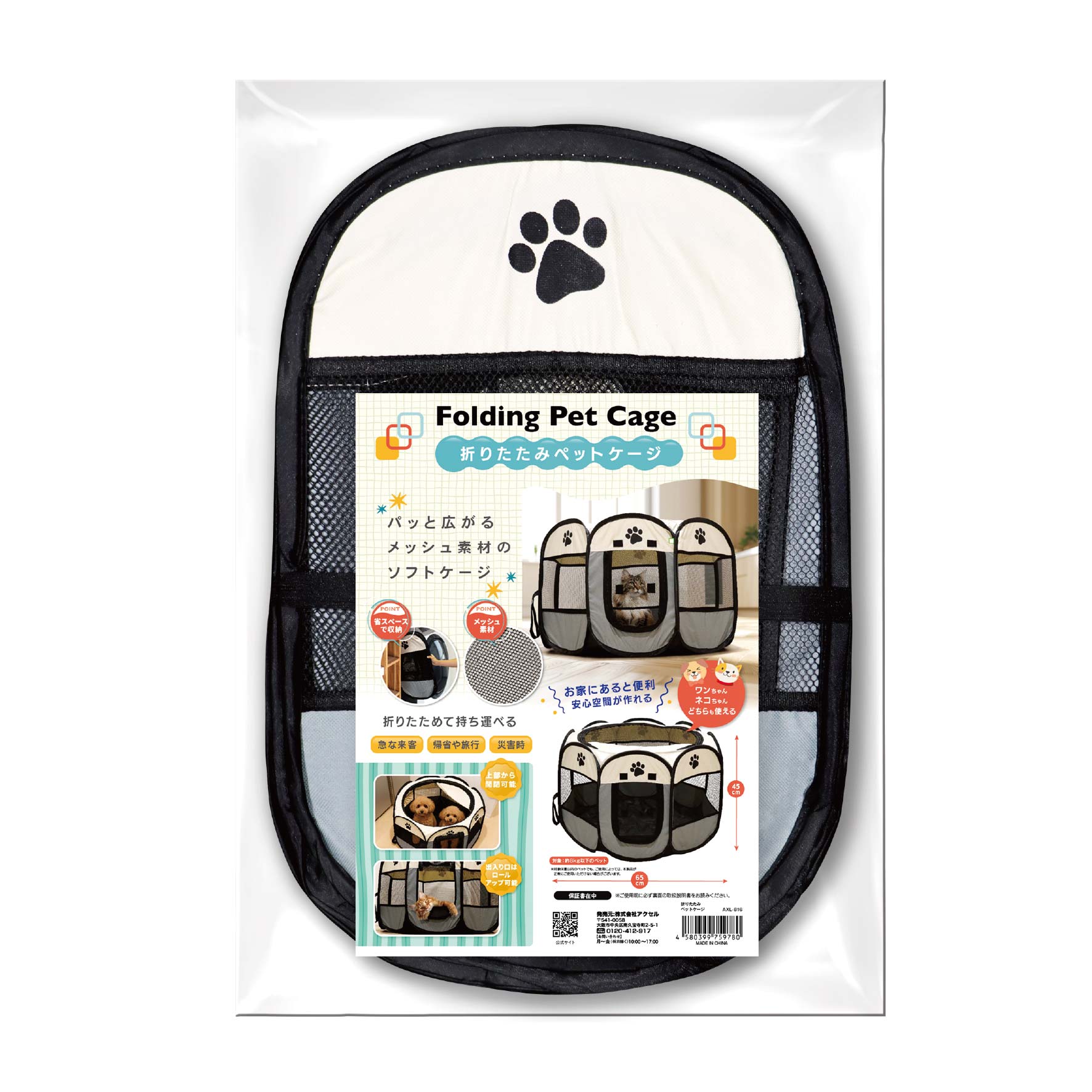 折りたたんで持ち運びができるメッシュ素材のソフトケージです。急な来客、帰省や旅行、災害時などに便利。上部から開閉可能で、側面の窓はロールアップ可能です。