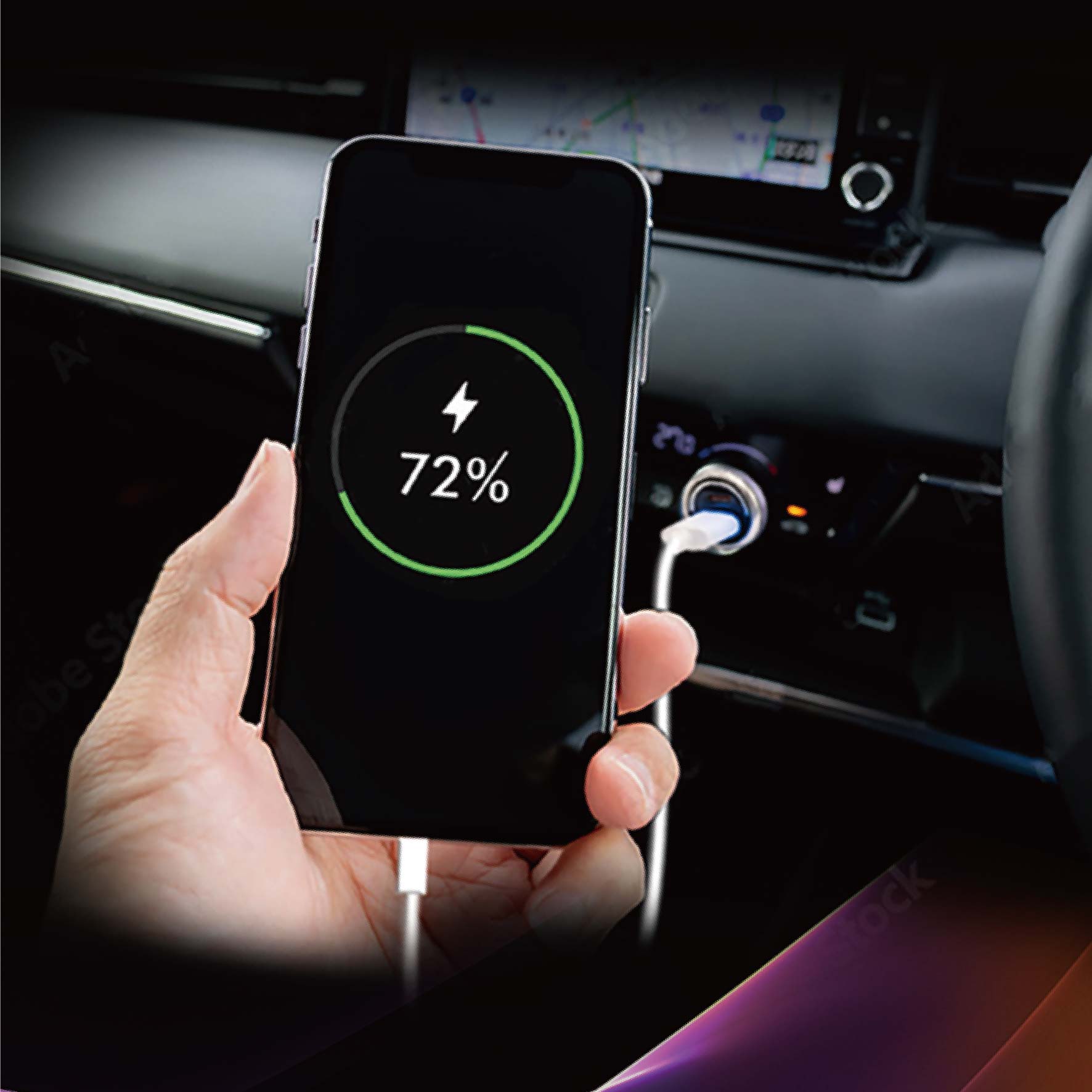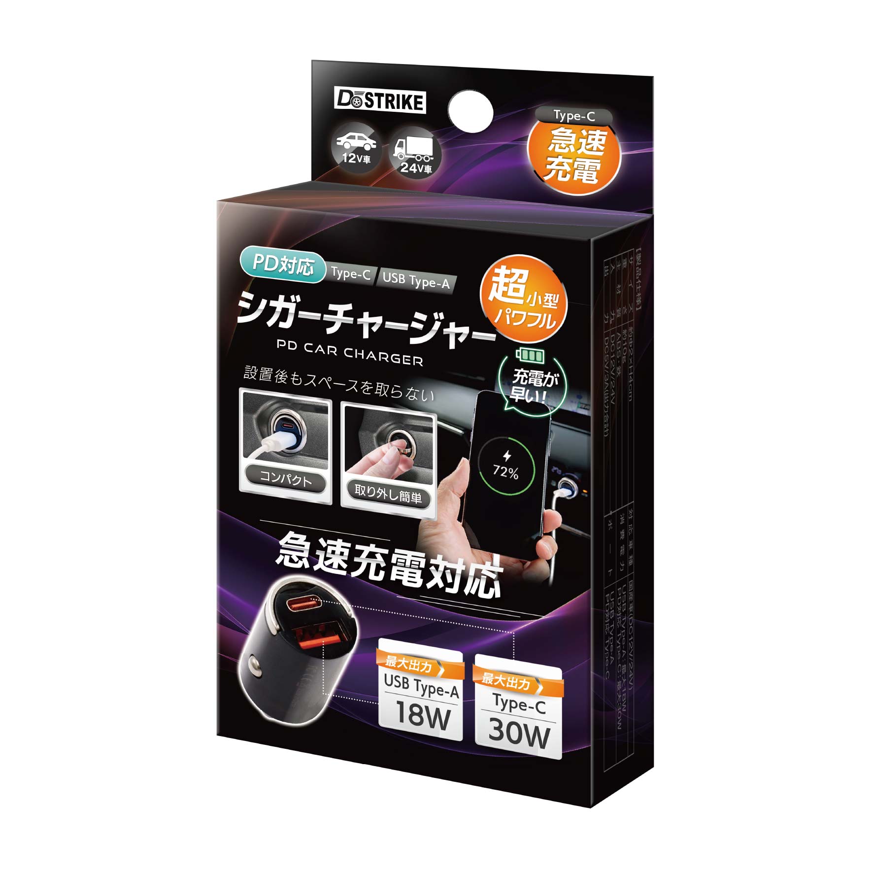 設置後もスペースを取らない超小型のシガーチャージャーです。ポートはPD対応 Type-C・USB Type-Aの2種類。急速充電対応です。