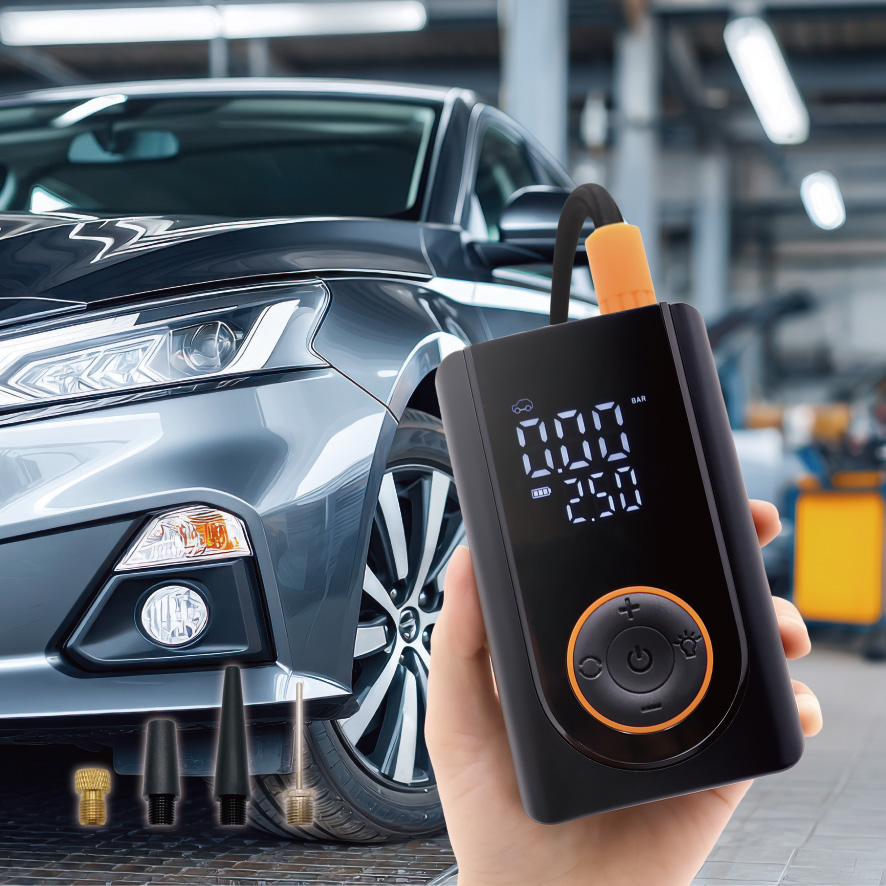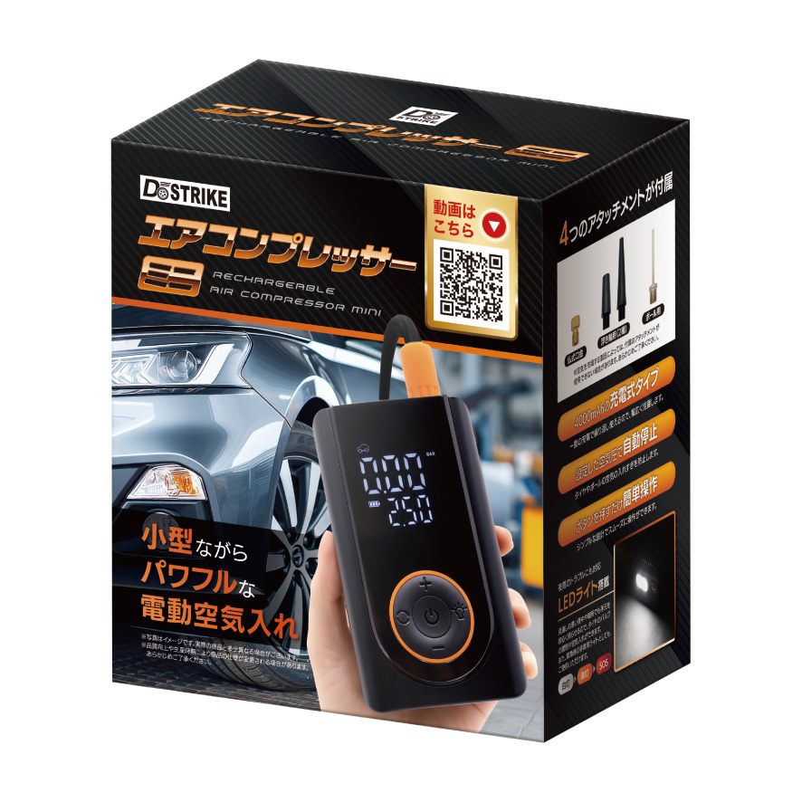 タイヤやボールなどの空気入れを電動で簡単に操作ができます。設定した空気圧で自動停止します。夜間や暗所でも作業ができるLEDライト付き。