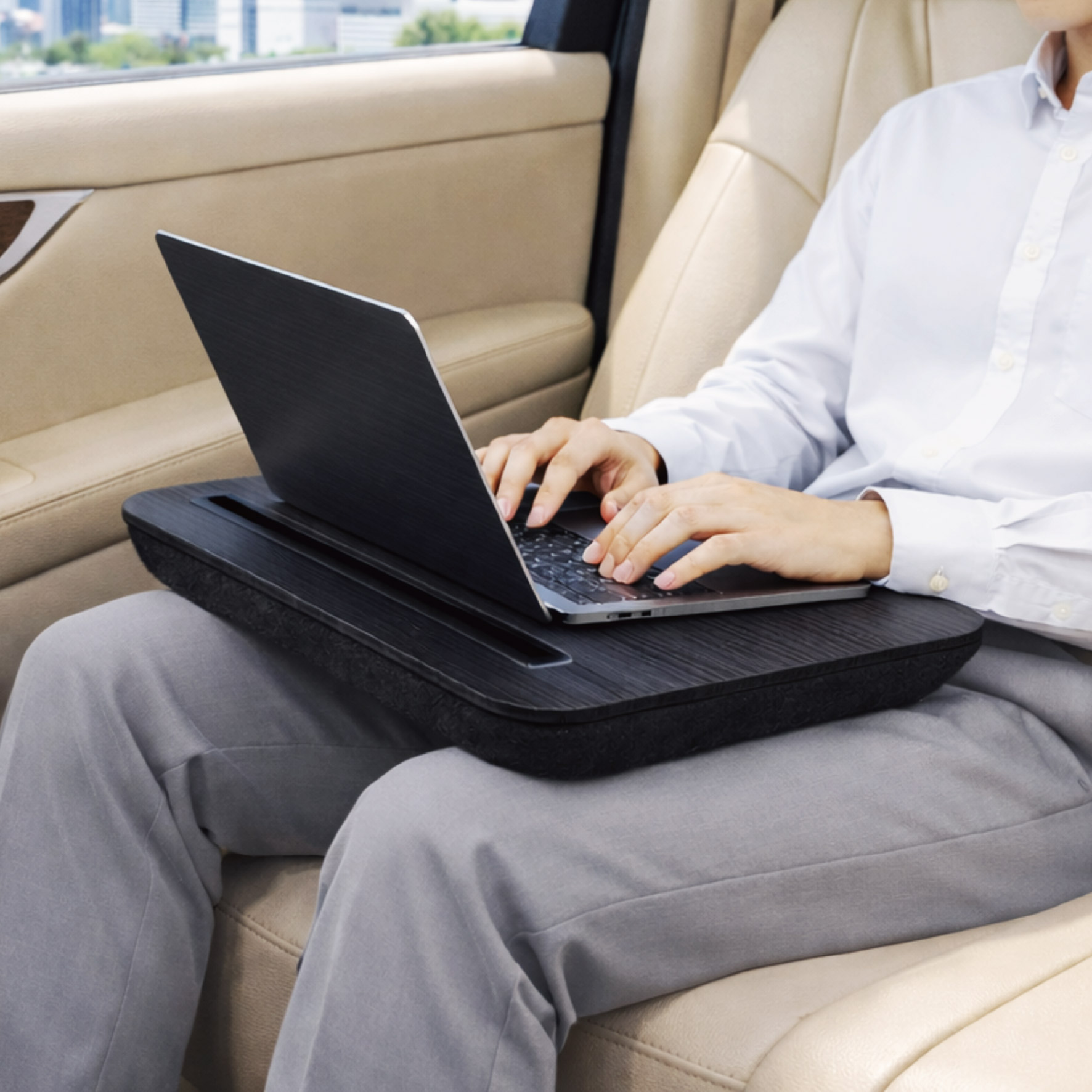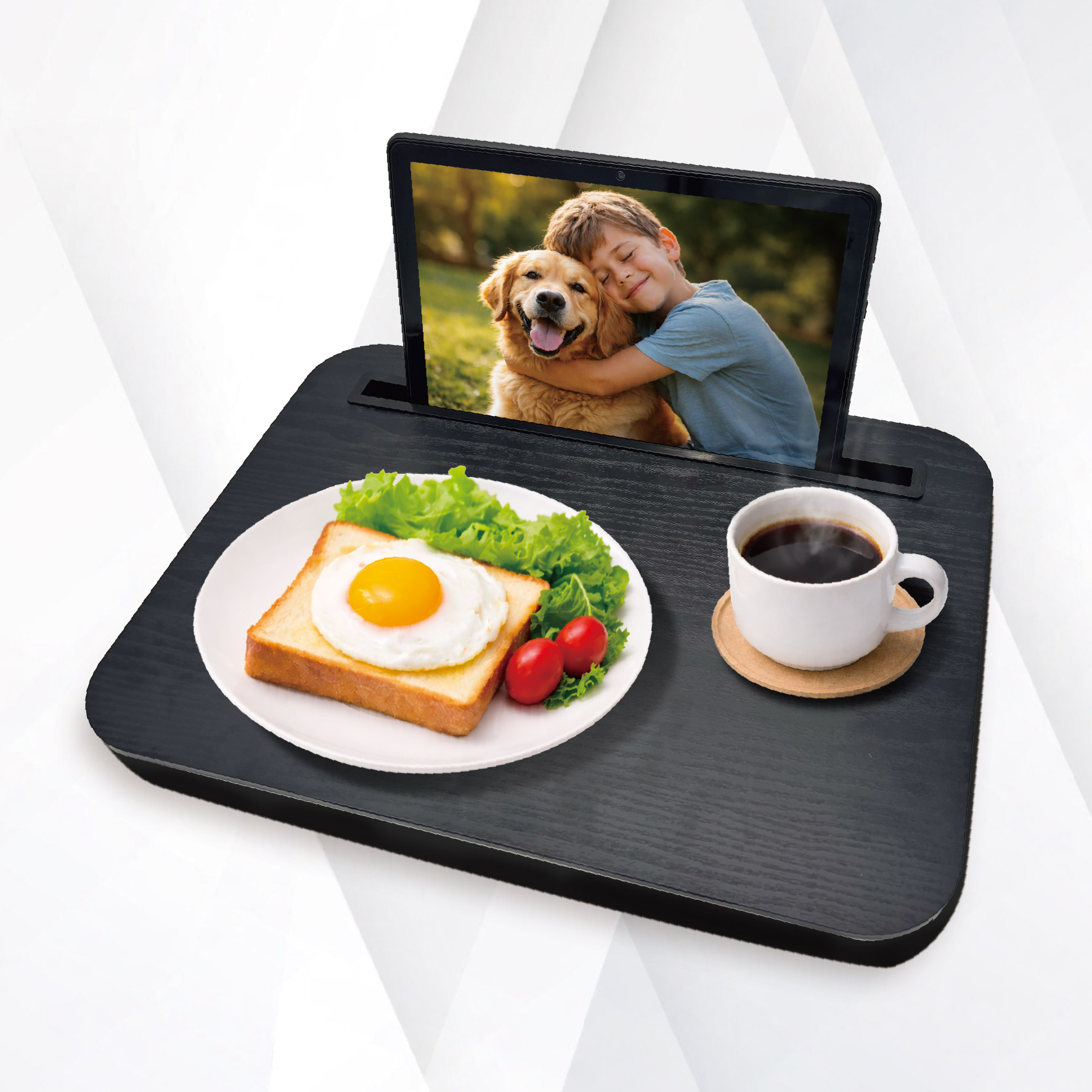 テーブルとクッションが一体化しており、場所を選ばずひざ上を快適スペースにします。スマートフォンやタブレットを差し込めるスタンド付き。
