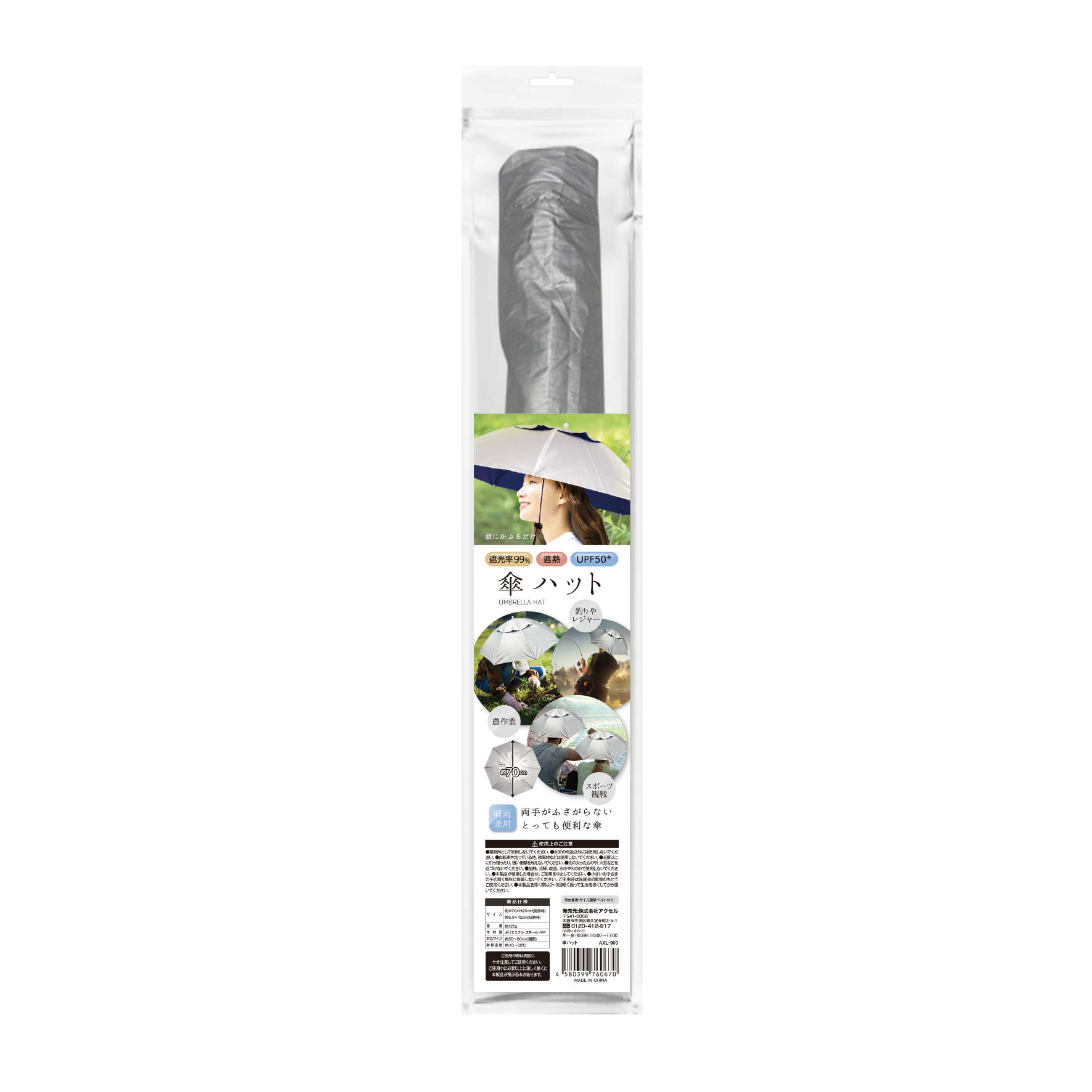 両手がふさがらず便利で軽い傘です。晴雨兼用・男女兼用で幅広くお使いいただけます。遮光率99%・遮熱・UPF50+。釣りやレジャー、農作業などあらゆるシーンで活躍します。